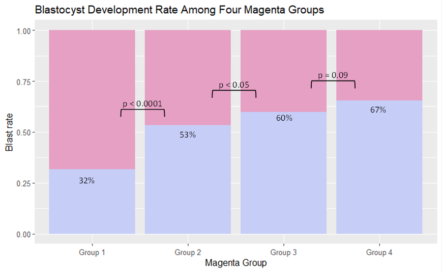 Con el fin de poder determinar si una herramienta de análisis de imágenes basada en IA, como lo es MAGENTA™, puede clasificar morfológicamente a los ovocitos con una puntuación siendo más alta en aquellos ovocitos que generalmente alcanzan el estadio de blastocisto, nos proponemos a validar este sistema en nuestro laboratorio. Para eso, el objetivo del presente trabajo consiste en determinar si existen diferencias significativas en la tasa de llegada a blastocisto entre los 4 grupos de calidad ovocitaria definidos por Magenta, en pacientes que realizan tratamientos de ICSI.