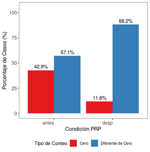 Antes del PRP el 42.9% de los casos no tuvo recuperación de ovocitos y el 57.1% sí. Después del PRP el 11.8% no logró obtener ovocitos y el 88.2% sí (GRÁFICO 1).