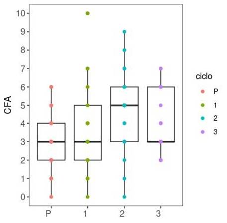 2. CFA en ciclo previo (P) y 3 ciclos posteriores al PRP (1,2,3)