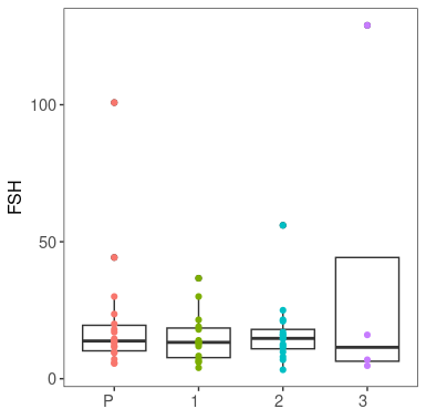 La FSH se mantuvo estable entre el ciclo 1 y 2 con respecto al ciclo previo al PRP, mostrando mayor variabilidad en el tercer ciclo, con tendencia al descenso de la media sin diferencias significativas (Gráficos 3).