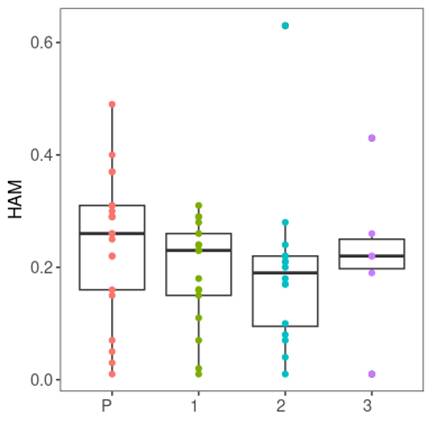 Gráfico 4. HAM en ciclo previo (P) y 3 ciclos posteriores al PRP (1,2,3)