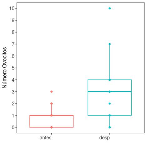 El número de ovocitos obtenidos mostró diferencia significativa post PRP con respecto a la previa (P <0.01) (Gráfico 8).