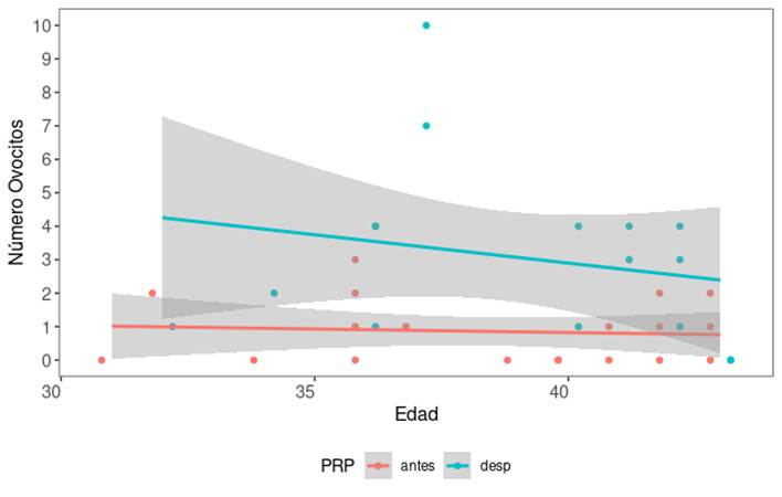 Materiales y Métodos: Incluyó 32 casos, se establecieron 3 grupos etarios (<35; 36-39; 40-44). Mediante centrifugación se obtiene el PRP luego es inyectado en los ovarios. Análisis de los datos Modelo Lineal Generalizado Mixto, con distribución Poisson.