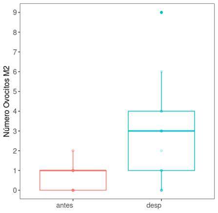El número de ovocitos M2 mostró diferencia significativa post PRP con respecto a la previa (P <0.01) (Gráfico 10).