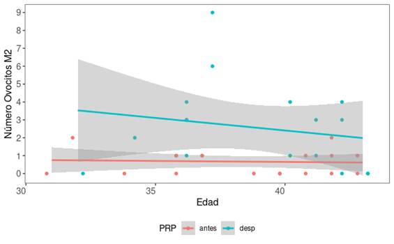 La cantidad de ovocitos M2 antes del PRP se mantuvo constante en todas las edades, después del PRP se observa mayor cantidad en todas las pacientes con tendencia al descenso a mayor edad, sin diferencias significativas (Gráfico 11).