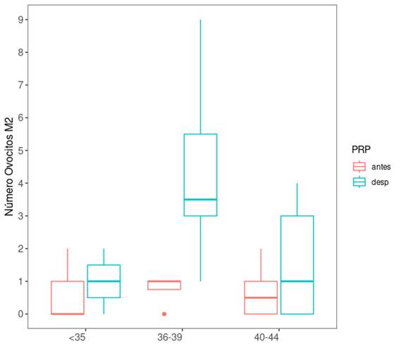 El número de ovocitos M2 obtenidos post PRP fue mayor en los 3 grupos etarios.